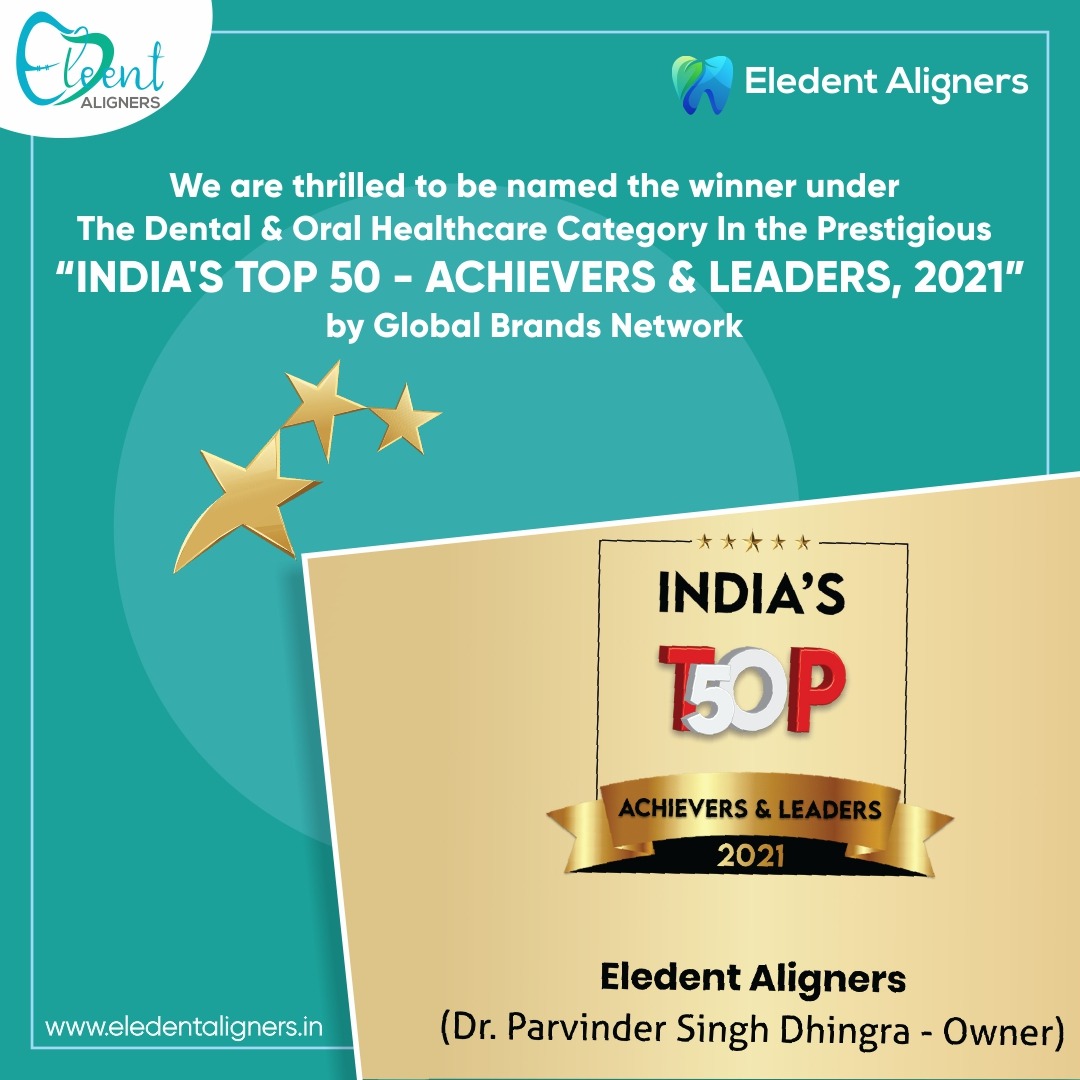 Winner in the Dental & Oral Healthcare Category at “India’s Top 50 – Achievers & Leaders 2021”, awarded by Global Brands Network, a Praxis Media Group undertaking. This recognition highlights excellence in delivering high-quality orthodontic and clear aligner solutions.